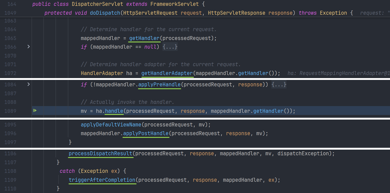 getHandler(): 요청에 맞는 컨트롤러(Handler) 찾기getHandlerAdapter(): 찾은 Handler를 실행할 수 있는 Adapter 찾기applyPreHandle(): 전처리(Interceptor의preHandle()) 실행handle(): 컨트롤러 메서드를 실행하여, 요청 처리하기applyPostHandle(): 후처리(Interceptor의postHandle()) 실행processDispatchResult(): View Resolver를 통한 응답 처리triggerAfterCompletion(): 예외 발생 시 처리