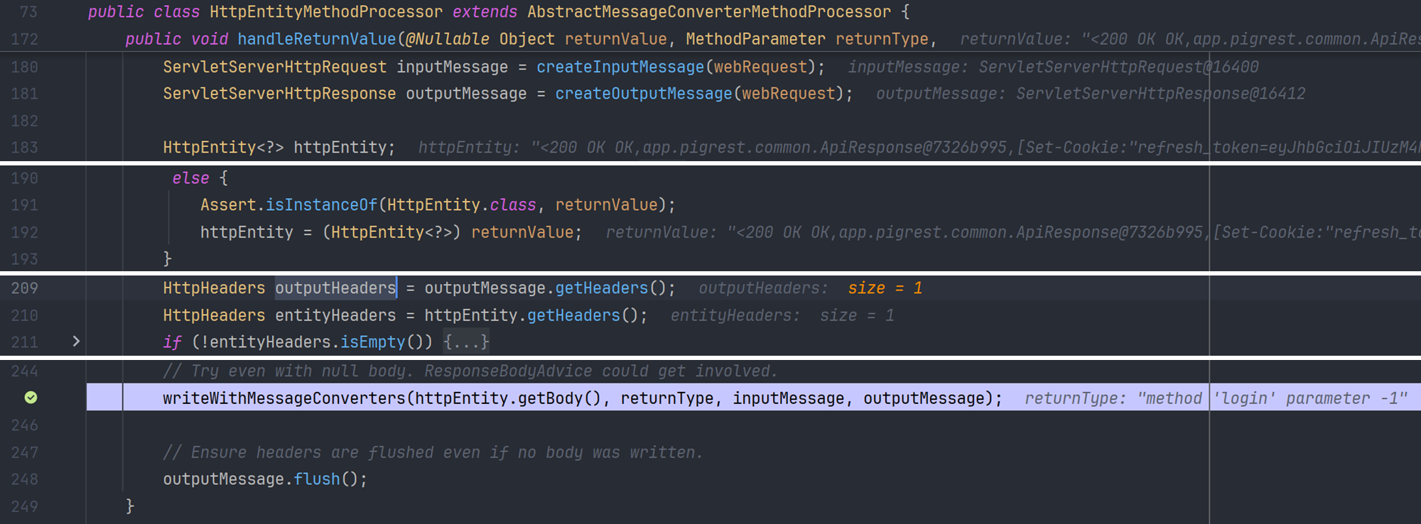 handleReturnValue() 는 컨트롤러의 반환값을 HttpEntity 로 변환하고 상태 코드와 헤더를 설정한다. 그리고 writeWithMessageConverters() 를 호출하여 응답을 처리한다.
