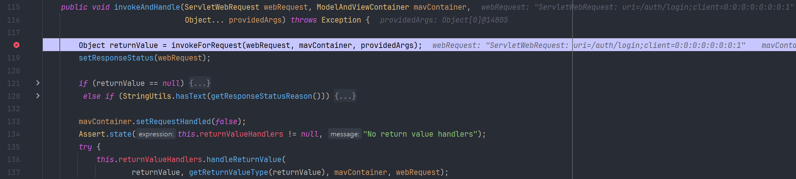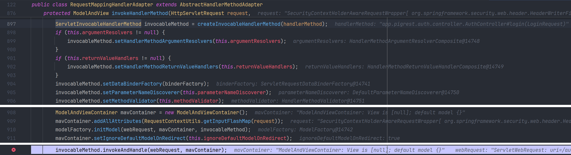 invokeHandlerMethod() 는 요청 처리에 필요한 객체들을 초기화하는 과정을 거친 후, 실제 컨트롤러의 메서드를 실행하는 invokeAndHandle() 를 호출한다.