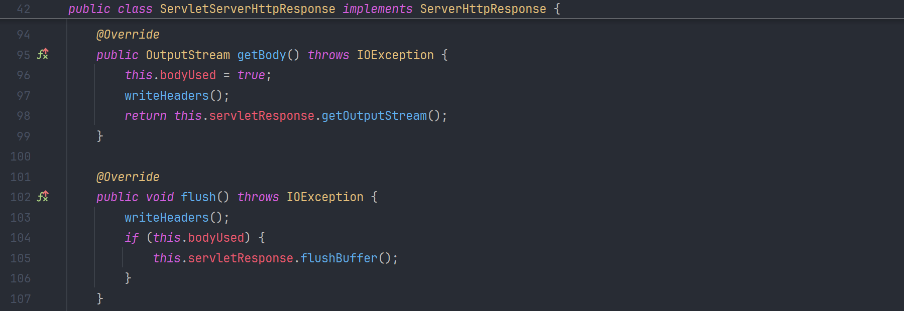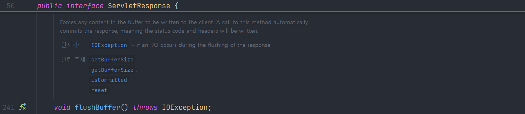 이 flush() 메서드는 내부적으로 flushBuffer() 를 호출하는데, 이는 ServletResponse 인터페이스에 선언되어 있다.