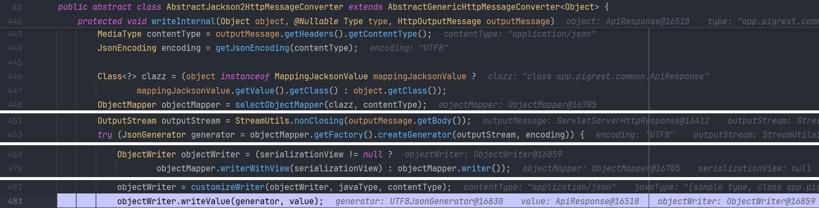 해당 메서드에서 Jakcson의 ObjectMapper.writeValue() 를 통해 Java 객체를 JSON 문자열로 직렬화하고 응답 스트림에 기록한다.