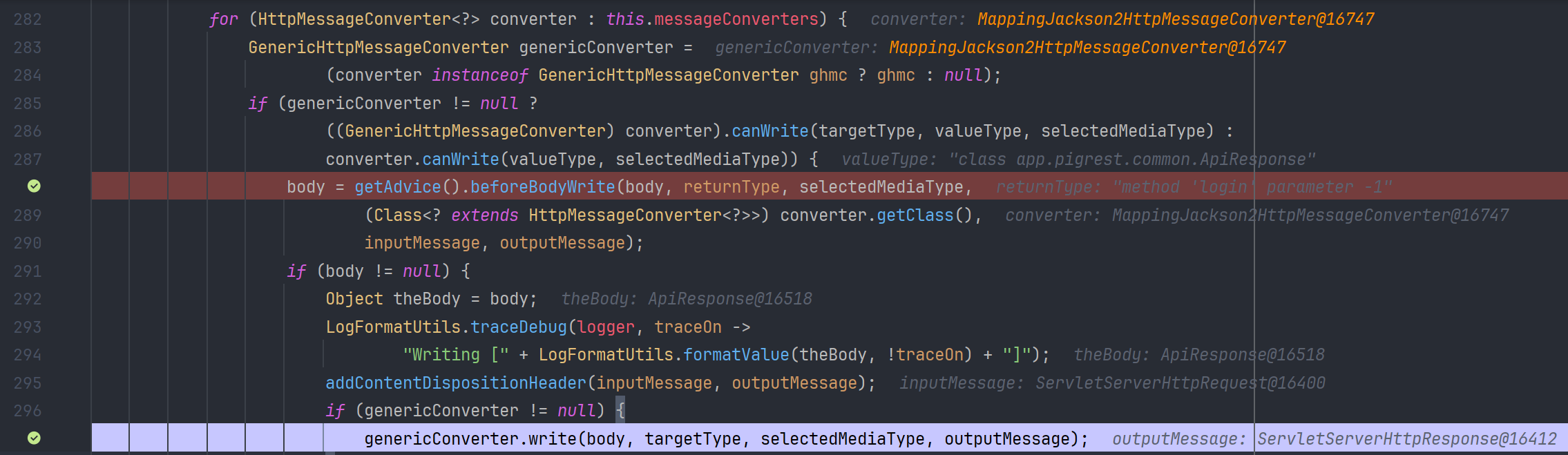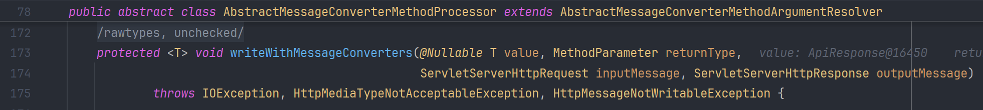 writeWithMessageConverters() 는 등록되어 있는 HttpMessageConverter 목록 중 적합한 converter를 선택해서, Response Body를 작성하는 write() 함수를 호출한다.